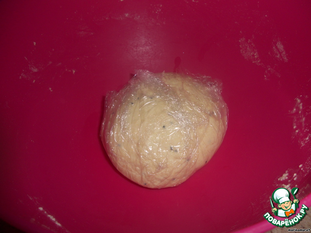 Если месите руками, тогда на это уйдет 5-7 минут. Сначала тесто липнет, а потом по истечение 3-4 минут становится как пластилин. Смазываем тесто оливковым маслом, делаем шар, заворачиваем в пленку и кладем в теплое место на 1 час.