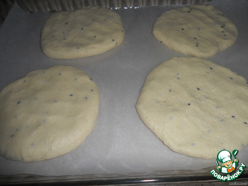 Разделить тесто на 4 части, придать каждой части форму лепешки толщиной 2 см. У меня одна лепешка получилась немного тонкая, сильно я увлеклась лепкой.:) Выкладываем на застеленный бумагой для выпечки противень и сверху накрываем пленкой. Оставляем в теплом месте еще на 40 минут.