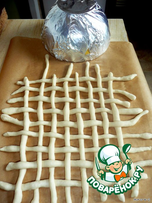 Из дрожжевого теста скатать валики толщиной не более 1 см, из которых сплести решетку. Лучше выкладывать валики на ПЕРГАМЕНТ.