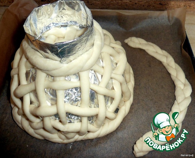 Сверху делаем кольцо из фольги,чтобы косичка при выпечке не деформировалась.