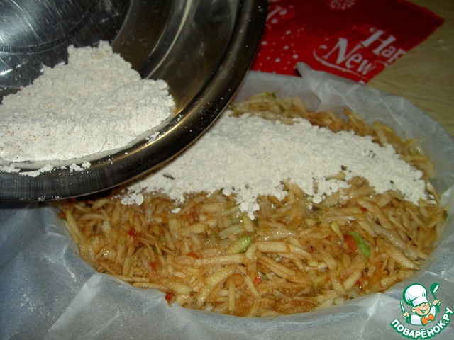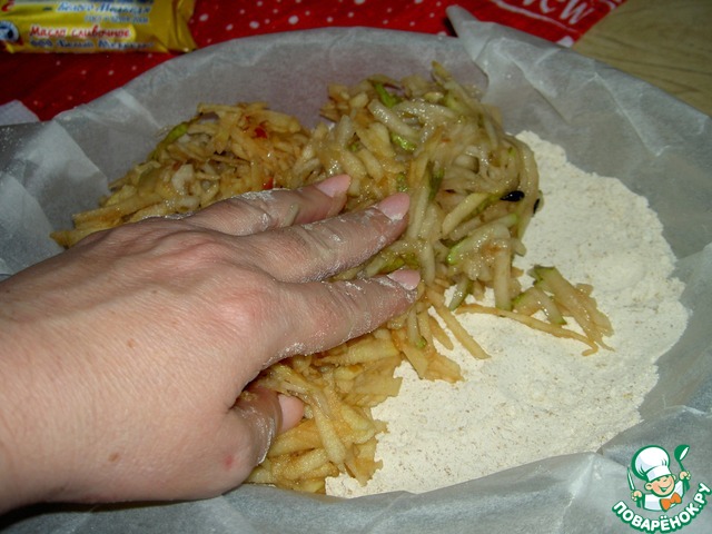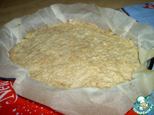 Затем нужно насыпать большую часть сухой смеси на дно формы и разровнять, не утрамбовывая. И сверху распределить наши натёртые фрукты (Вместе с соком!)