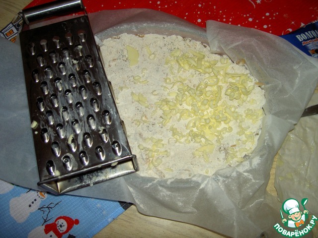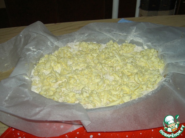 Я тру масло прямо "на весу", однако это не всем может показаться удобным. Поэтому натрите его на тарелочку, а затем посыпьте сверху на пирог воздушными крошками масла