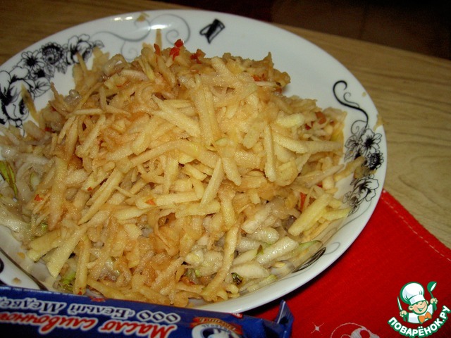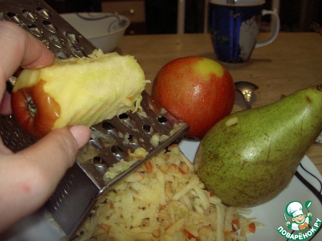 Сначала я натираю на крупной тёрке 2 больших яблока и крупную грушу, желательно сладких сортов, т. к. это позволяет мне уменьшить до минимума кол-во сахара (фруктозы)