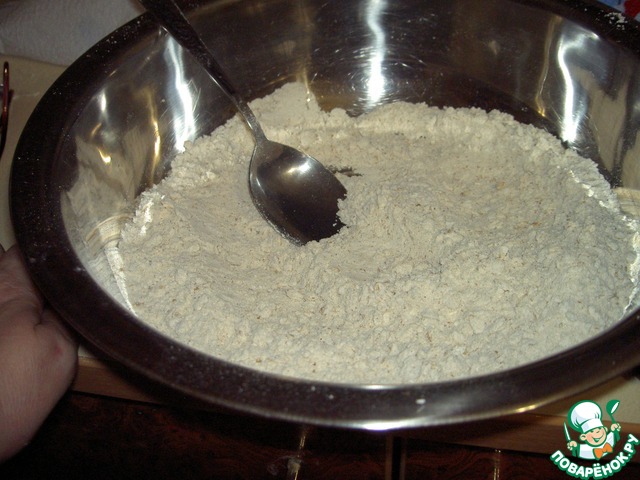 Затем смешиваю в миске все сухие компоненты. Муку обязательно просеиваю с целью обогащения кислородом. Это обязательно нужно делать! Если учесть то, что в муке иногда попадаются посторонние включения.