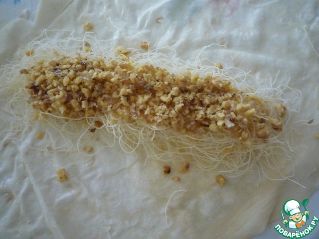 Выкладываем на половинку теста кадаиф, сверху измельченный грецкий орех.