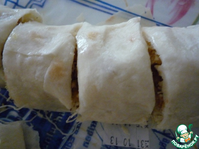 Свернуть рулет. Немного смазать маслом с водой конец теста, чтобы рулет не развалился. Разрезать рулет (ширина, примерно, два пальца).