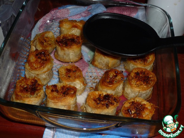 Горячий кадаиф поливаем холодным сахарным сиропом. Оставляем на полчасика в сиропе (иногда снова собираем щербет и поливаем).