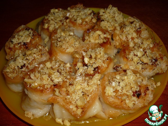 Сверху каждого рулетика выкладываем измельченный грецкий орех или фисташками (очень мелкими).