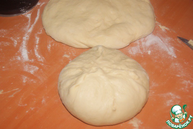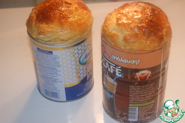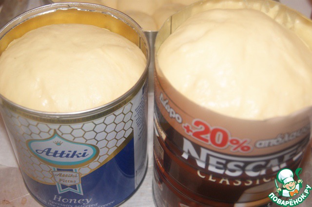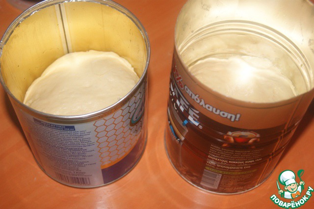 Тесто обмять, сформовать в булочки диаметром чуть меньшим, чем диаметр формы. Я использовала банки от растворимого кофе.