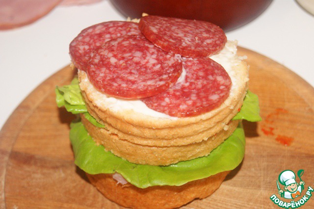 Намазать соусом и поместить ветчину, накрыть ее листиком салата...