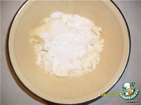 Творог взбить блендером с размягчённым маслом и сахарной пудрой.