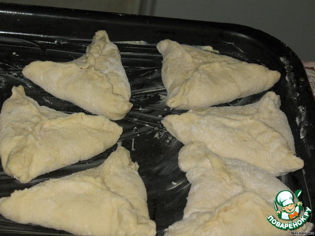 Тесто делим на кусочки, раскатываем тесто, как на обычные пирожки. Кладем в центр кружка начинку и защипываем сочник. Складываем их на смазанный маслом противень. Выпекаем при температуре 200-250 град. около 30 мин.