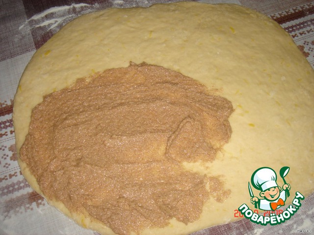 Раскатать тесто в пласт толщиной 1 см и намазать сахарно-масляничной массой. Свернуть в рулет.