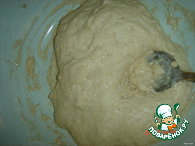 Молоко подогреть и развести в нем дрожжи. Добавить 100 г муки, перемешать и оставить на 30 мин.