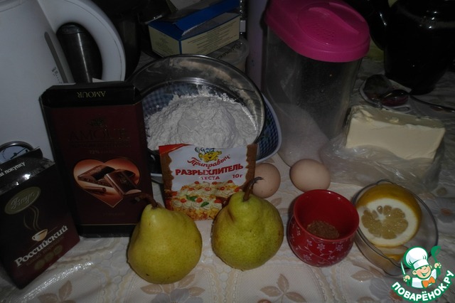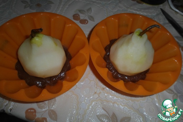 2. Очищаем груши от кожуры и удаляем из них зерна через основание. Сбрызгиваем лимонным соком. В каждую грушу вкладываем по кусочку шоколада.