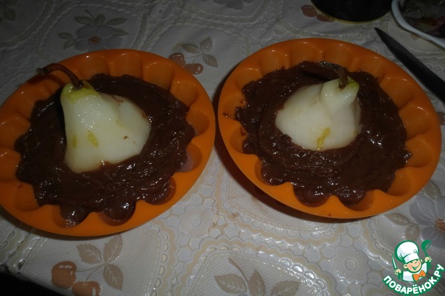 5. В формочки выкладываем по 1,5-2 ст. л. теста и вдавливаем по груше.