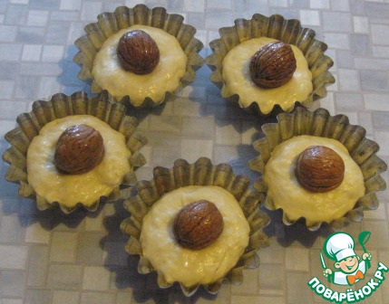 В средину каждой формы поместить орех, слегка прижать. Оставить для поднятия теста на 10-15 минут, выпекать в духовке при т. 180 гр. в течении 35-40 минут.