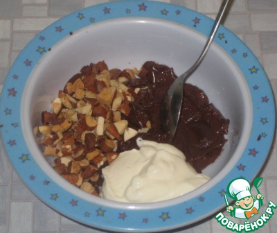 Приготовить начинку: орехи измельчить, шоколад растопить на водяной бане, добавить сливки, перемешать.