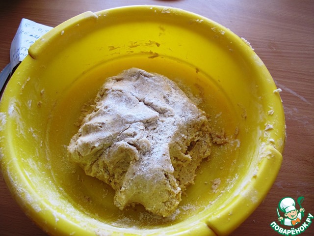 Из муки, сахара, масла и двух желтков замесить песочное тесто. Убрать в холодильник на 1 час.