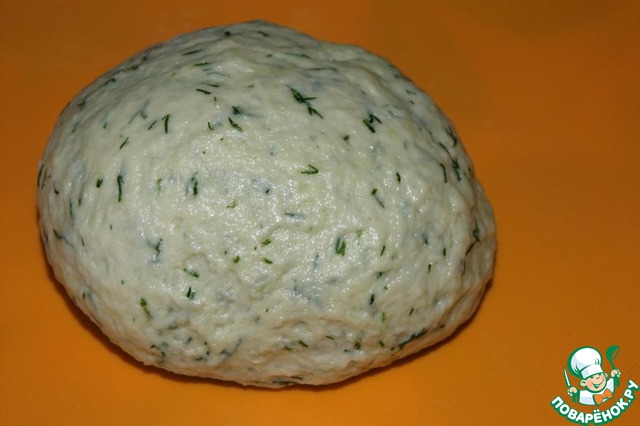 Теперь в миску нужно насыпать 1 стакан муки, в нее влить укропную смесь и тщательно перемешать.
