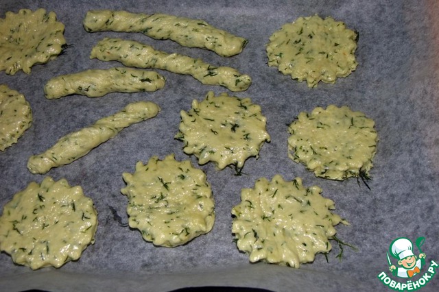 Пока наше тесто отдыхает, нужно подготовить противень, застелив его пергаментом для выпечки, и разогреть духовку до 200 градусов. Затем тесто надо раскатать в пласт, толщиной около 1см, и при помощи формочки вырезать печенье. Разложить его на противне. Из остатков теста я сделала жгутики. И отправляем печеньки в духовку минут на 30. Если у Вас духовка печет неравномерно, то печенье лучше один раз перевернуть. Вообще по времени приготовления, ориентируйтесь на свою духовку и толщину печенек, главное, чтобы они не вышли очень сухими.