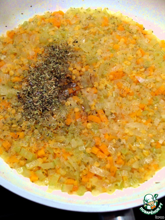 Добавить чечевицу .Подлить горячий овошной бульон( или воды) и довести до кипения. Убавив огонь варить пока чечевица не будет почти готова.