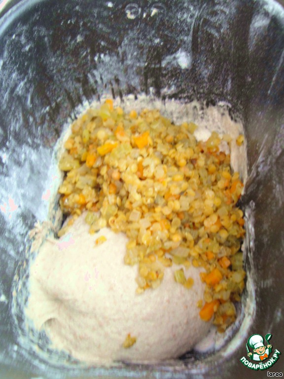 Тем временем заложим в хлебопечку пшеничную муку(у меня цельнозерновая), ржаную муку, дрожжи ,сахар,200 теплой воды и соль. Дадим немного замесится и добавим наши овоши( у меня машина подает сигнал). После машина еше раз перемешает тесто и оставит подниматься.