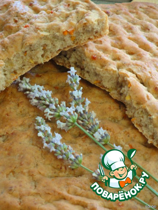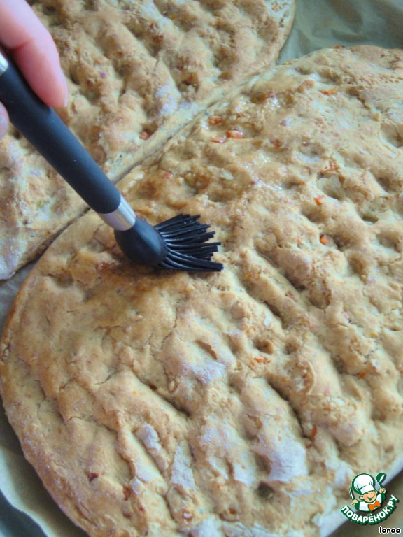 Включить разогреваться духовку до 200°C. В стаканчике смешать оливковое масло с 3 шепотками соли и 1 ст.л воды. Окуная постоянно пальцы в масленую смесь, сделать в лепешках углубления.