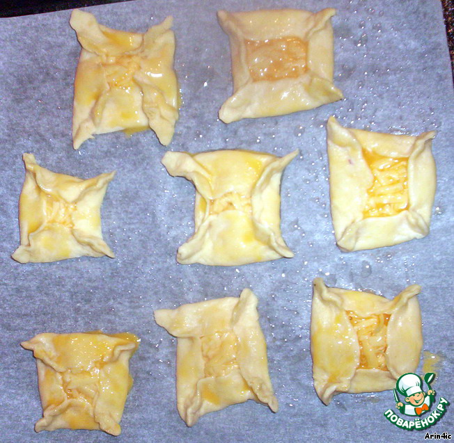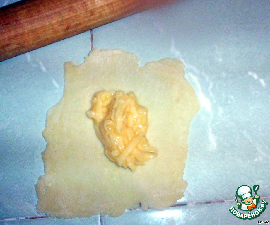 Раскатать 8 лепешек толщиной около 4 мм. В серединку лепешки положить начинку и защипать с четырех сторон.