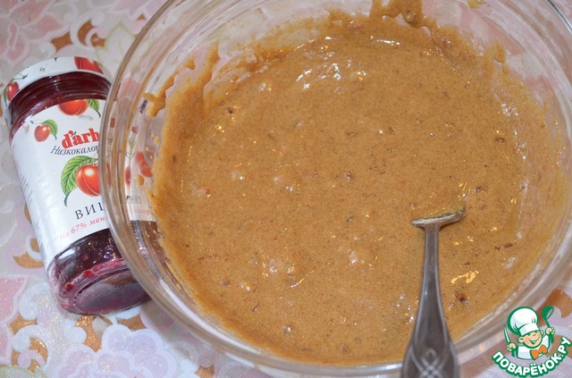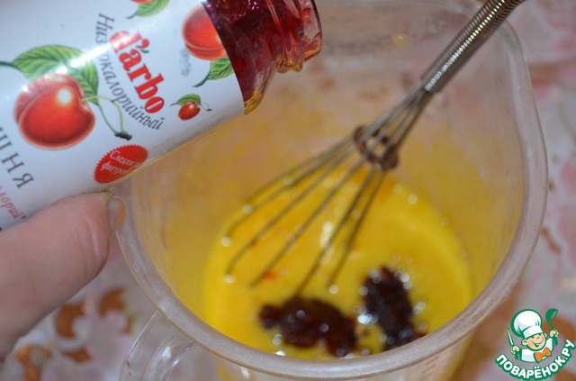Яйца взбить с сахарной пудрой венчиком. Добавить конфитюр D'arbo (можно вместо конфитюра добавить мед).