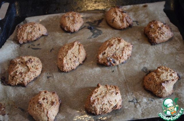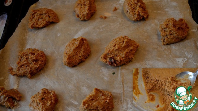 Через пол часа мука разбухнет и тесто из жидкого станет рыхлым. Выкладываем ложкой на смазанный маргарином пергамент. Я формую печенье столовой ложкой с горкой (выход 10шт), но можно делать их более плоскими или формовать чайной ложечкой)