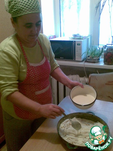 заливаем заливкой: сметана, взбитая с яйцом.