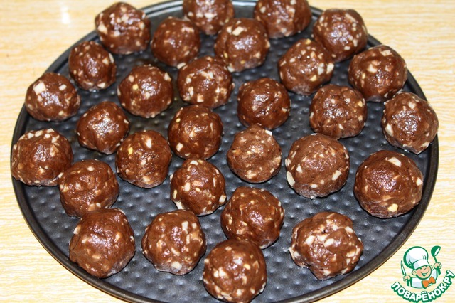 Отщипываем небольшое количество теста и катаем шарики размером с грецкий орех. Можно добавить во внутрь ягодку (например, вишню) или сухофрукты (курага, финик, изюм). Орехи добавлять не рекомендую, поскольку после жарки белок даст ощущение его присутствия. Но не настаиваю ;)) Выкладываем "орешки" на противень.