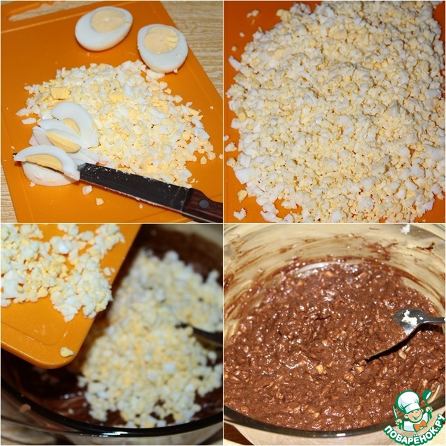 Вареные яйца мелко, мелко порубить или натереть на мелкой терке. Добавить в массу и тщательно перемешать.