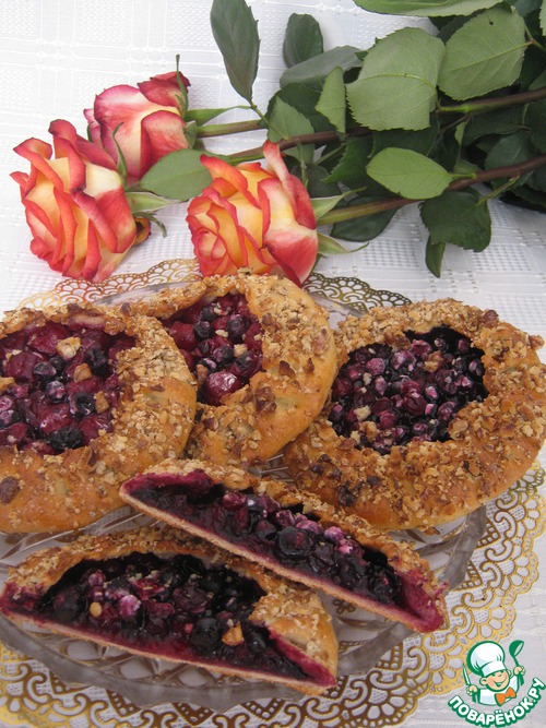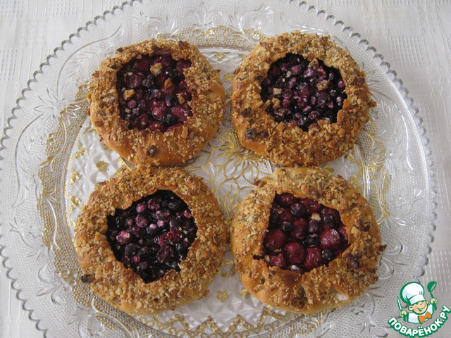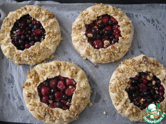 Смородину смешайте с клюквой и также добавьте 2 ложки сахара и 1 ложку крахмала. Получается две галеты с вишней и две со смородиной и клюквой.