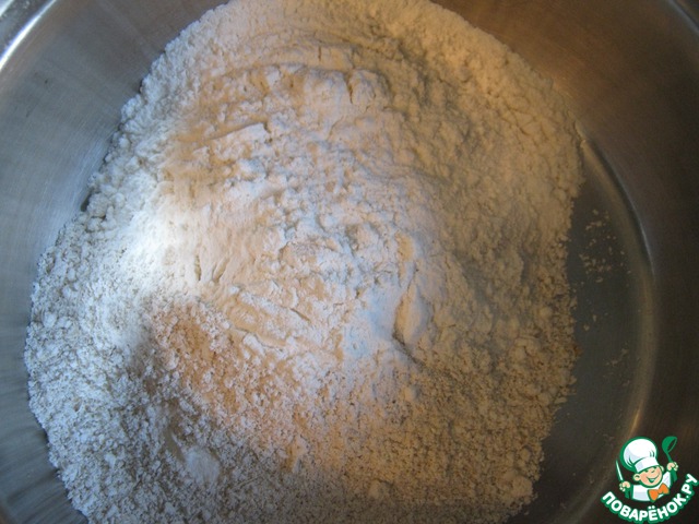 Овсяную муку смешать с пшеничной мукой и с разрыхлителем.
