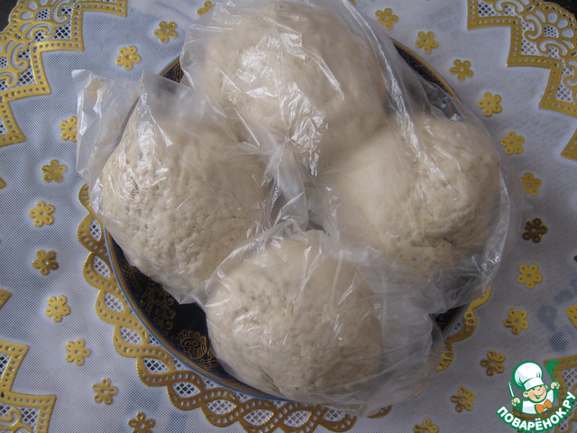 Разделить тесто на четыре равные части, накрыть пленкой и оставить "отдыхать"на 30 минут.