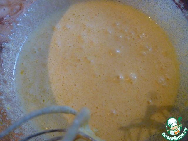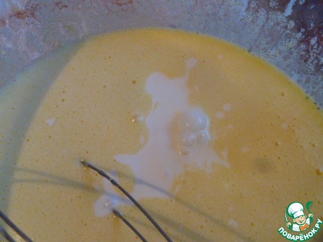Затем добавила 1/4 ч. л. соды смешанной с 1 ( 250 мл) стаканом муки, сразу просеивая в тесто через ситечко.