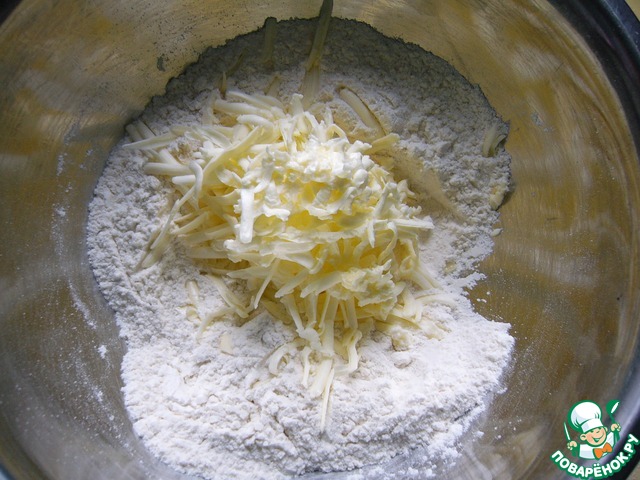 Добавить натёртое на крупной тёрке охлаждённое масло и перетереть руками в крошку
