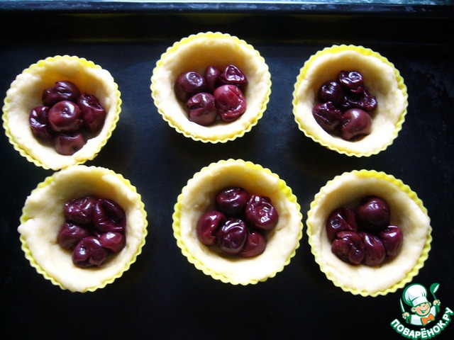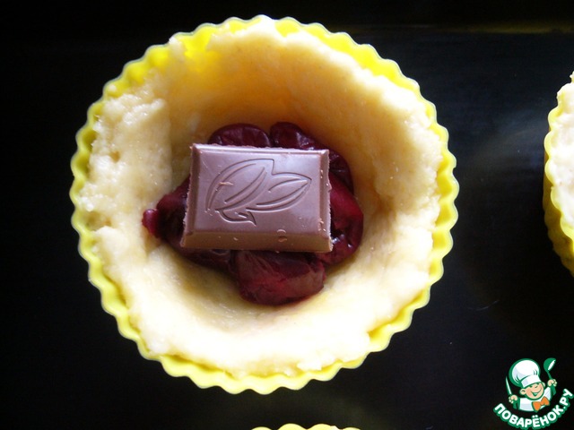 Положить внутрь каждой по 5 шт вишни (у меня предварительно разморожена и просушена от лишней жидкости)