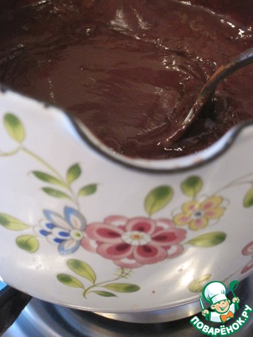 Приготовим глазурь шоколадную, для этого сметану, сахар, какао перемешаем и поставим на огонь, доведем до кипения, поварим несколько минут, добавим сливочное масло и еще немного поварим, до тех пор, пока глазурь загустеет.