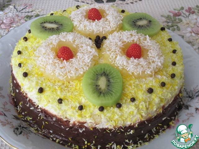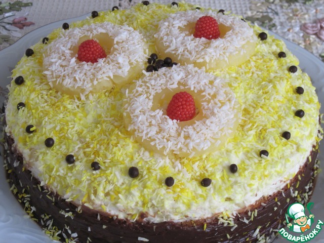 Присыпим крем желтой кокосовой стружкой. Положим колечки ананаса, присыпим его белой стружкой. По желанию украсим конфетками. Обмажем шоколадной глазурью бискитный корж.