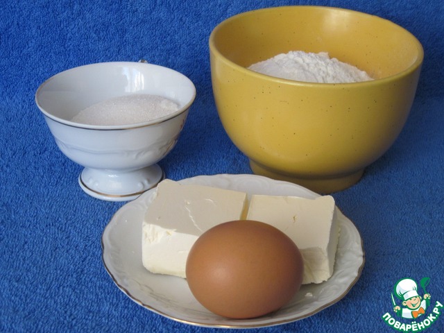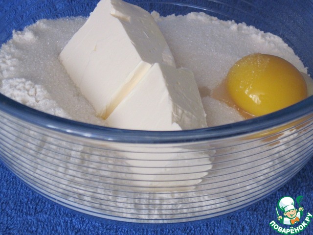Приготовить продукты для песочного коржа. Для теста используется только желток, мука, сахар, маргарин.