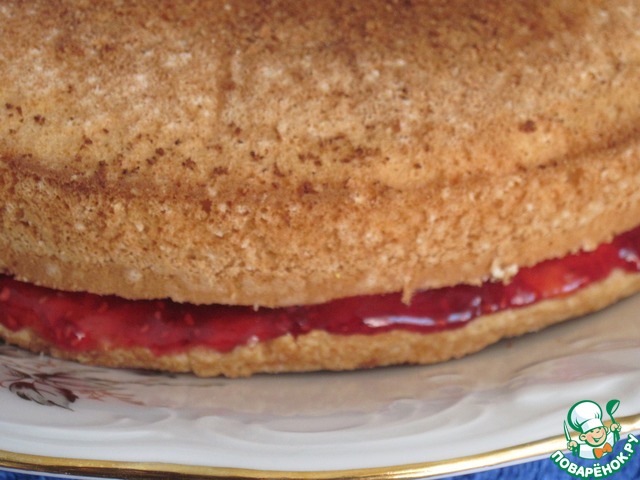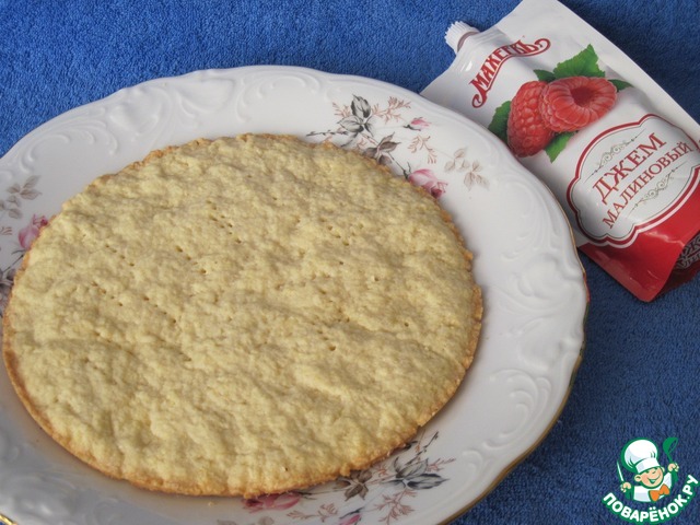 Остуженный песочный корж смажем малиновым джемом. Малиновый джем очень ароматный.