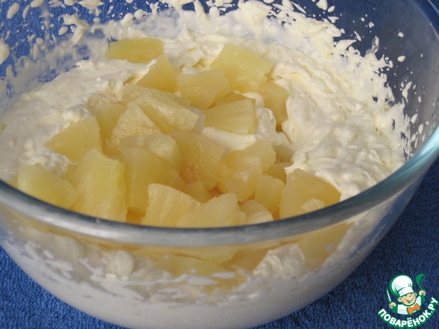 Порежем кольца ананаса на кусочки, добавим в крем. Желатин подогреем до состояния, когда он растворится и добавим в крем, не забудим 3 колечка ананаса оставить для украшения.