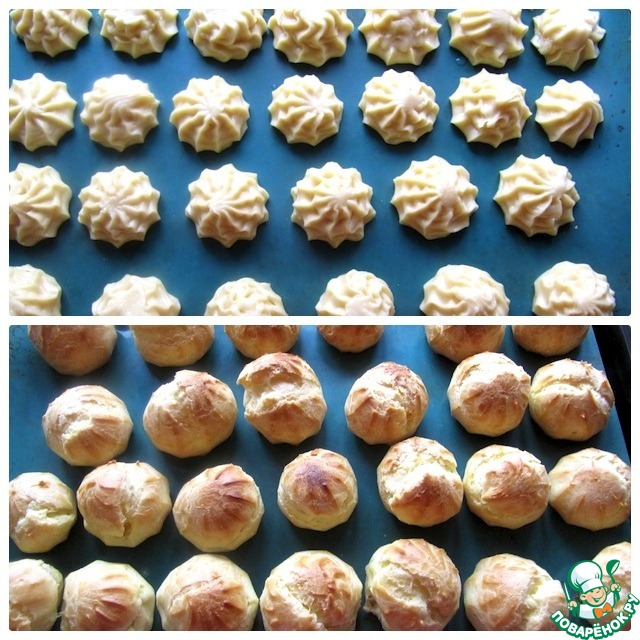 Отсадить шу на силиконовый коврик или бумагу для выпечки, не смазывая ничем. Предварительно разогреть духовку до 230 С, отправить в духовку, не открывать! Как только шу хорошо поднимутся и начнуть слегка румяниться - уменьшить температуру до 170 С и выпекать до хорошо золотистого цвета. Шу лучше слегка пересушить, чем они останутся внутри влажными! Готовые шу охладить.