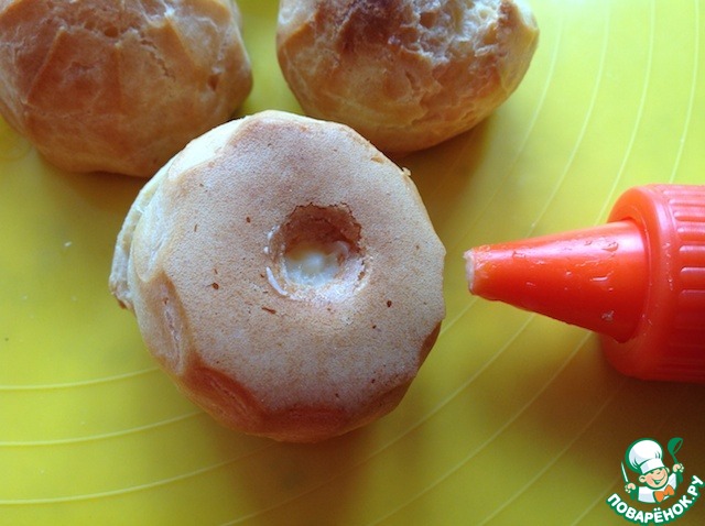 Остывшие шу наполнить подготовленным масляным кремом через прокол в донышке, используя кондитерский мешок.