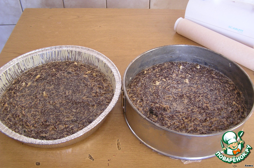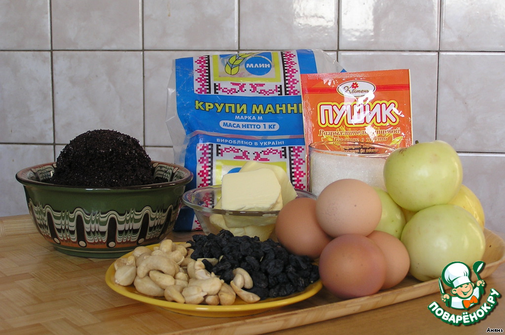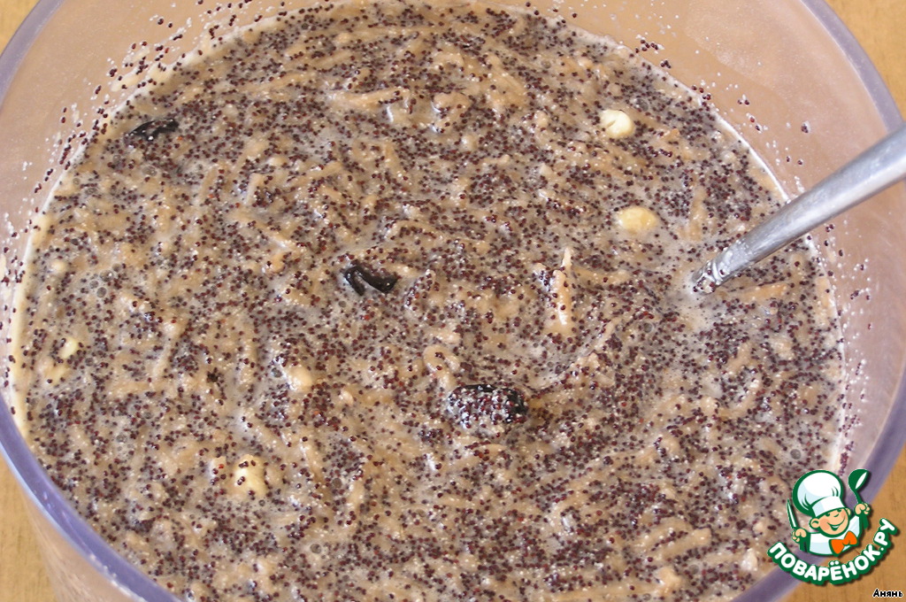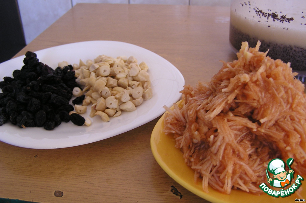 Мак предварительно запарить, ввести в тесто, взбить. Орехи обжарить, измельчить, изюм перебрать. Яблоки почистить и натереть на терке.