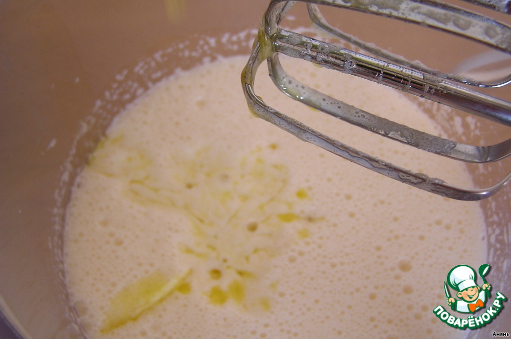 Белки взбить с сахаром. Затем по одному добавить желтки. Постепенно ввести растопленное масло.