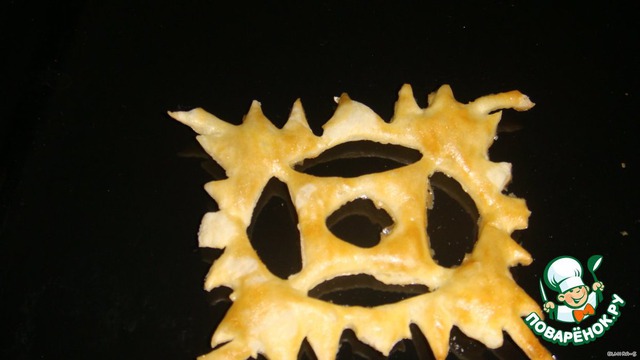 Вырезать(с помощью кухонных ножниц)переложить на противень,обмазать желтком и запечь в разогретой духовки до200С минут20
